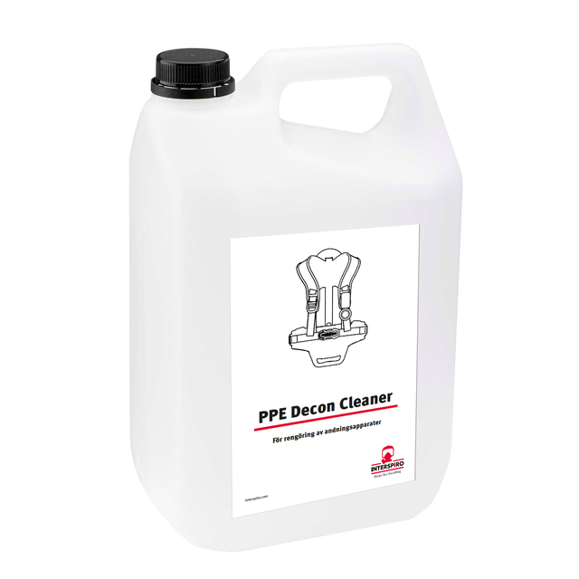 Interspiro vaskemiddel PPE Decon Cleaner er et effektivt rengjøringsmiddel spesielt utviklet for rengjøring av pusteapparater, luftflasker, bæremeis, slanger og flere andre kategorier av personlig beskyttelsesutstyr i maskin eller andre automatiske vaskemaskiner med høyt trykk. Det er også utmerket for rengjøring av blant annet arbeidsbenker, gulv og verktøy. Vaskemiddelet løser opp og tar bort sot, olje, fett og annen skitt fra blant annet rustfritt stål, aluminium, glass, plast, gummi, malte og lakkerte overflater.