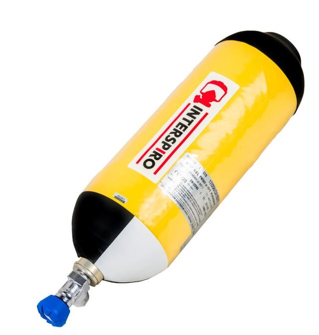 Interspiro full kompositt 9,0 liter med in-line flaske ventil . EFV kran og sikkerhetsratt. Ultra lett flaske med ubegrenset levetid NLL - Non Limited Life. Det gir veldig lav vekt og pålitelig konstruksjon. Det er flere alternativer for flaskekranene: