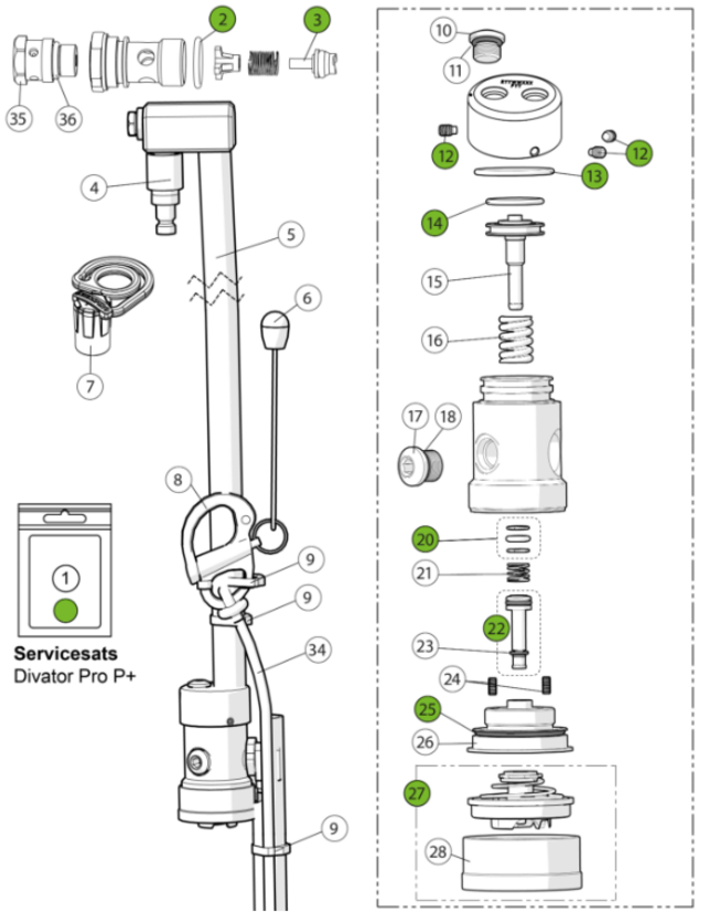 Interspiro servicekit for Divator Pro P+ regulator. Settet inneholder alle deler du trenger for en 10 års service.