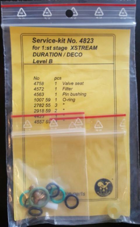 Poseidon service kit 1. trinn. Passer til Xstream , Duration/deco Level B. Setter består av Ventil sete , filter , pin bushing og o-ringer.