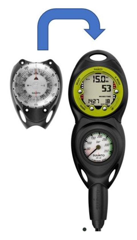 Suunto konsoll med svart Zoop , med toppmontert kompass. Suunto konsoll med trykkmåler og innebygget Zoop Novo computer. Medfølger kompass for montering på baksiden av computerdelen , ligger løst i esken.
